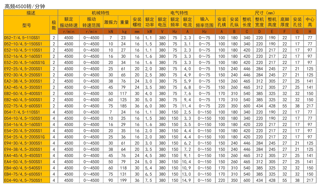 E类高频振动电机:(分为E5、E9、EA、EB、EC五个系列),球磨铸铁壳体,频率75HZ/150HZ,转速范围0-4500r/min,振动力15-90KN。