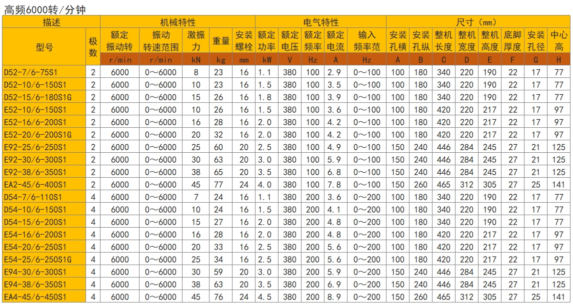 E类高频振动电机:(分为E5、E9、EA、EB、EC五个系列),球磨铸铁壳体,频率100HZ/200HZ,转速范围0-6000r/min,振动力15-45KN。