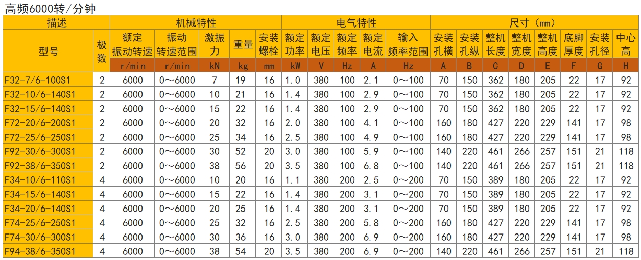 F系列:分为F3、F7、F9三种规格。该系列高频振动电机采用耐高温纯铜漆包线,绝缘等级H级,防护等级IP54、IP65,工作制S1、S3。